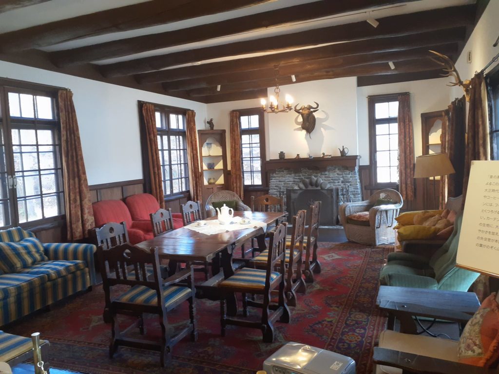 大きな暖炉、太い梁、軽井沢彫の家具棚、フランスで購入したカーテン、駐日フランス大使館の外交官から譲り受けた赤い絨毯など、現在の軽井沢別荘建築と比較しても引けを取らない、上質なサロンです。